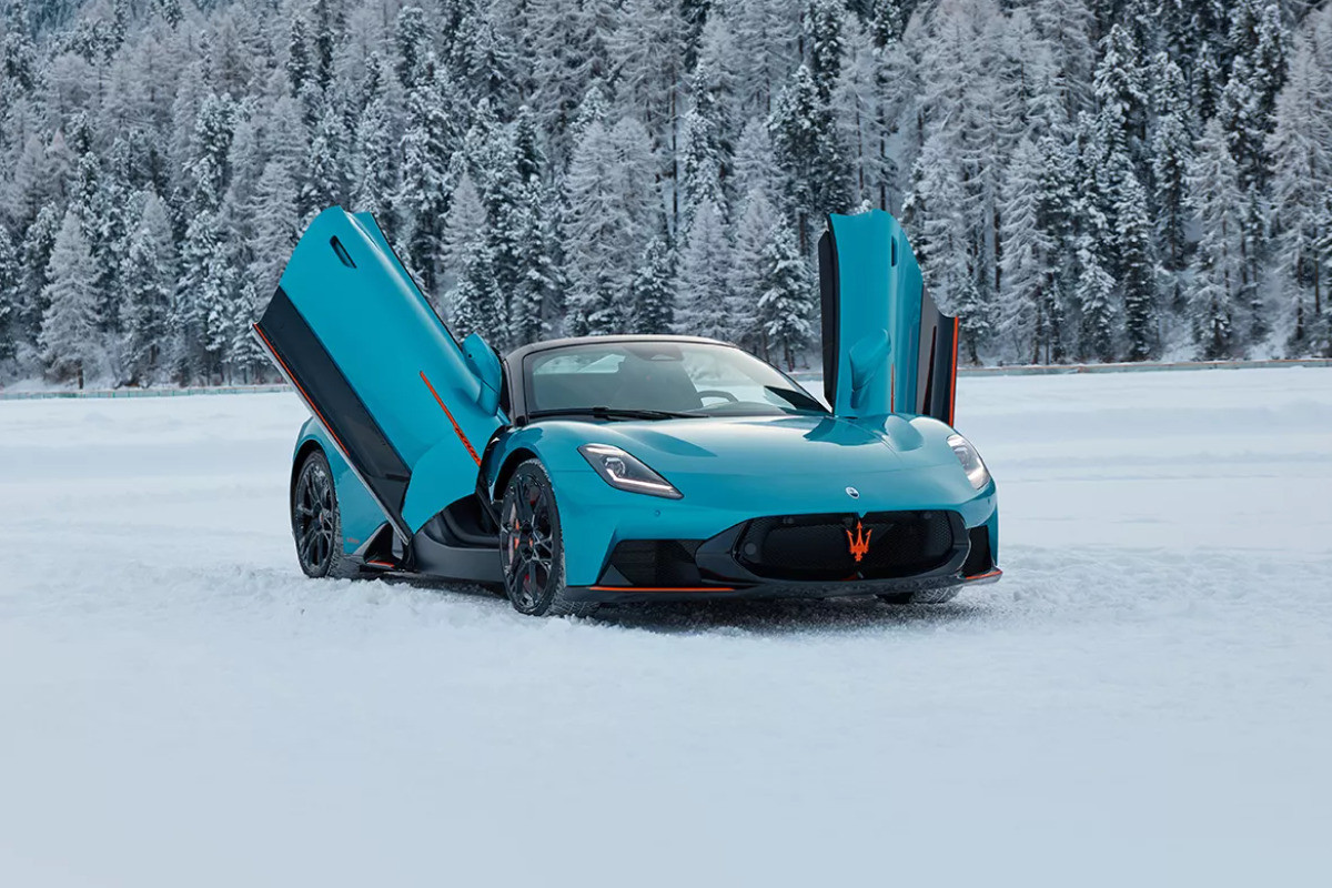 Также компания Maserati построила еще один уникальный суперкар — MCPura Cielo в исполнении Frozen Magma. Его разработали уже в рамках фирменной программы персонализации Fuoriserie и представили в швейцарском Санкт-Морице. Цвет Ai Aqua Rainbow, который меняет оттенок в зависимости от освещения, сочетается с ярко-оранжевым декором, а также с глянцево-черными деталями — вставками в нижней части кузова и 20-дюймовыми колесами. Карбон-керамические тормоза снабжены оранжевыми механизмами.