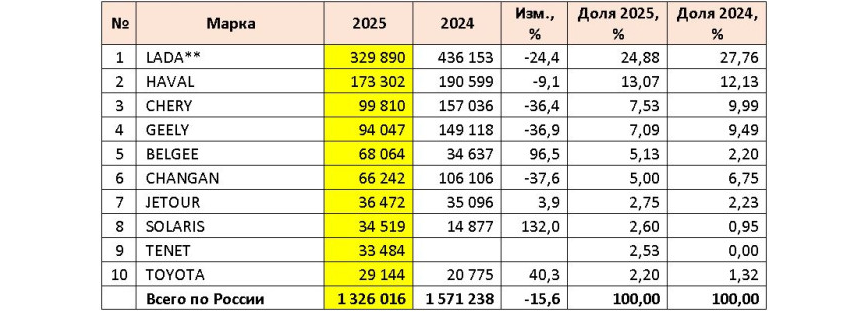 За весь 2025 год на российском авторынке было продано 1 326 016 новых легковых автомобилей. При этом самым популярным автопроизводителем остался отечественный АВТОВАЗ (329 890), который сумел реализовать почти четверть (24,88%) машин от всего объема авторынка, хотя год назад российскому автогиганту принадлежало около 28% рынка. Среди иностранных марок первенство удерживает Haval (173 302), за которым следуют Chery (99 810) и Geely (94 047). На пятом месте обосновался белорусский бренд Belgee (68 064). Замыкает десятку официально не представленная в России Toyota (29 144).