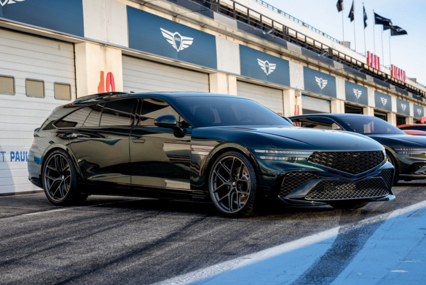 Впервые его показали на недавнем мероприятии во Франции, где дебютировали «заряженный» электрокроссовер GV60 Magma и концептуальный суперкар Magma GT со среднемоторной компоновкой, а на днях были опубликованы свежие фотографии. Пятидверка предсказуемо сохранила стандартную платформу G90 с колесной базой 3180 мм, но внешность универсала заметно отличается от исходника. Экстерьерными новшествами стали другой передний бампер, иная решетка радиатора и увеличенные воздухозаборники. Крылья заметно расширены, а на традиционных местах для размещения багажных направляющих установлены два угловатых аэродинамических плавника.