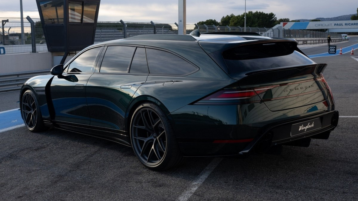 Абсолютно новая задняя часть универсала Genesis G90 Wingback дополнена спойлером, антикрылом и внушительным диффузором. В заднем бампере расположились четыре разновеликие выхлопные патрубки. Кузов окрашен в темно-зеленый цвет, а 22-дюймовые колеса обуты в низкопрофильные шины.