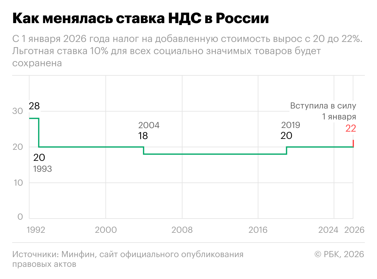 В 2019 году ставку повысили до нынешних 20%, а с 2026-го НДС составляет 22%.